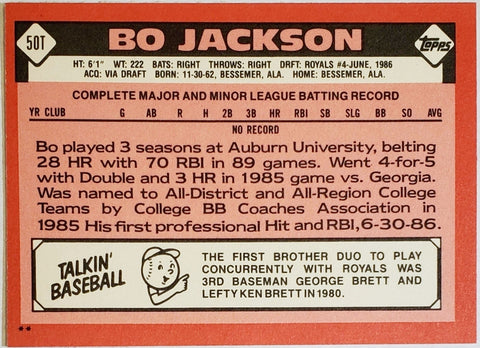 Bo Jackson Rookie 1986 Topps Traded #50T, KC Royals, Two-Sport Star