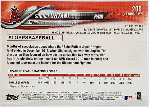 Shohei Ohtani Rookie 2018 Topps Opening Day #200, Angels, Dodgers, MVP