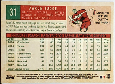 Aaron Judge "1959 Topps" Retro 2018 Topps Archives #31, Yankees, ROY!